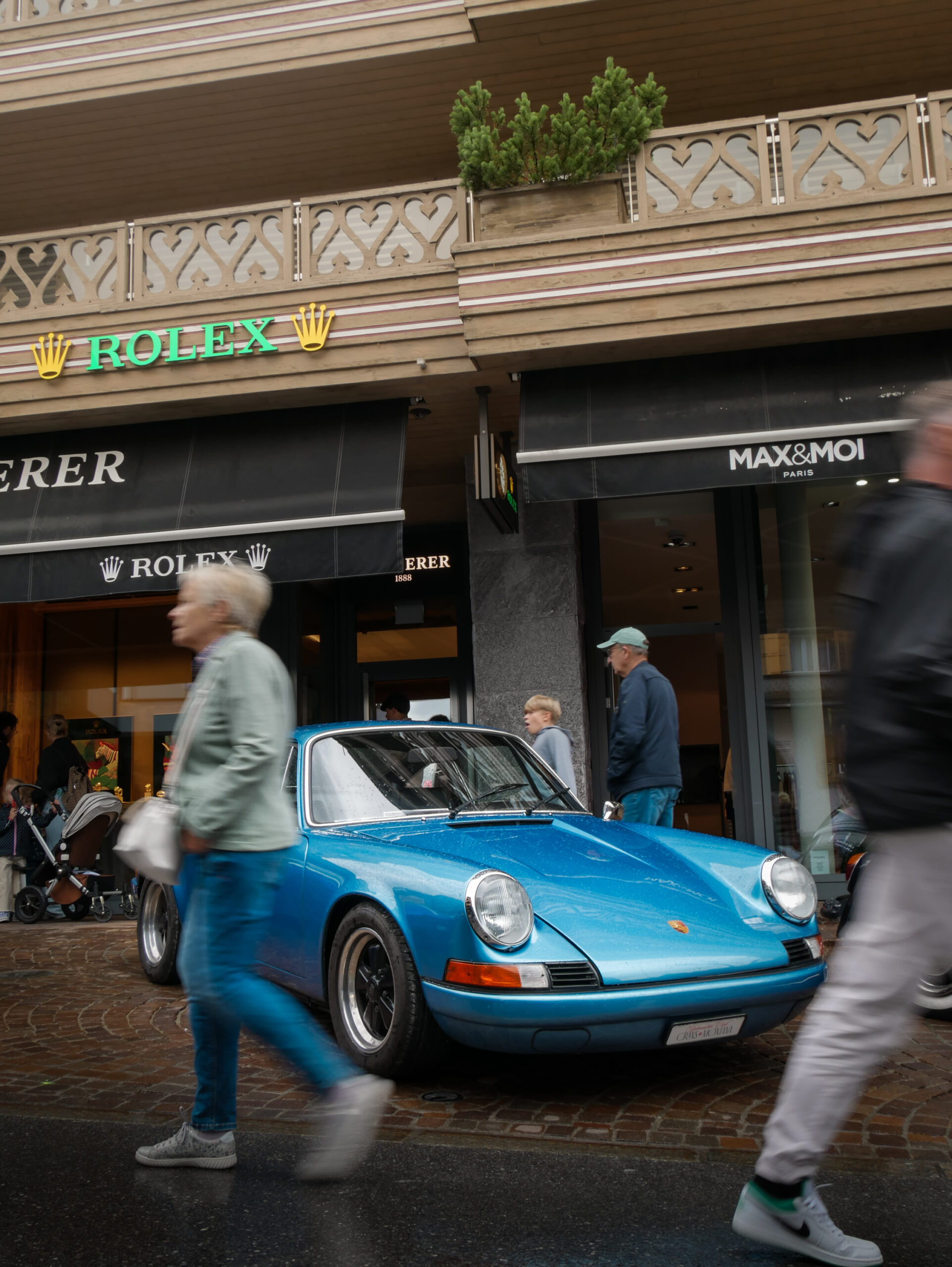 Au cœur du village, la rue du Prado s’est métamorphosée en galerie d’art à ciel ouvert. Alignées avec soin, des merveilles venues de toutes les époques attiraient les regards : carrosseries sculptées, chromes impeccables, odeurs d’huile et de cuir patiné. L’atmosphère est presque irréelle, suspendue entre nostalgie et admiration. Ici, chaque voiture racontait une histoire. Et il y en avait pour tous les goûts : de la dernière Porsche Boxster Spyder à la Nissan GTR R34, de la Ferrari F12 Tdf à la Jaguar Type E, ou encore de la magnifique Porsche 911 Sport Classic à l’Aston Martin Vantage, sans oublier les Mustangs, 911 et Ferrari issues d’un autre temps. L’Audi Quattro et la Lancia Delta Integrale en sont aussi les témoins.