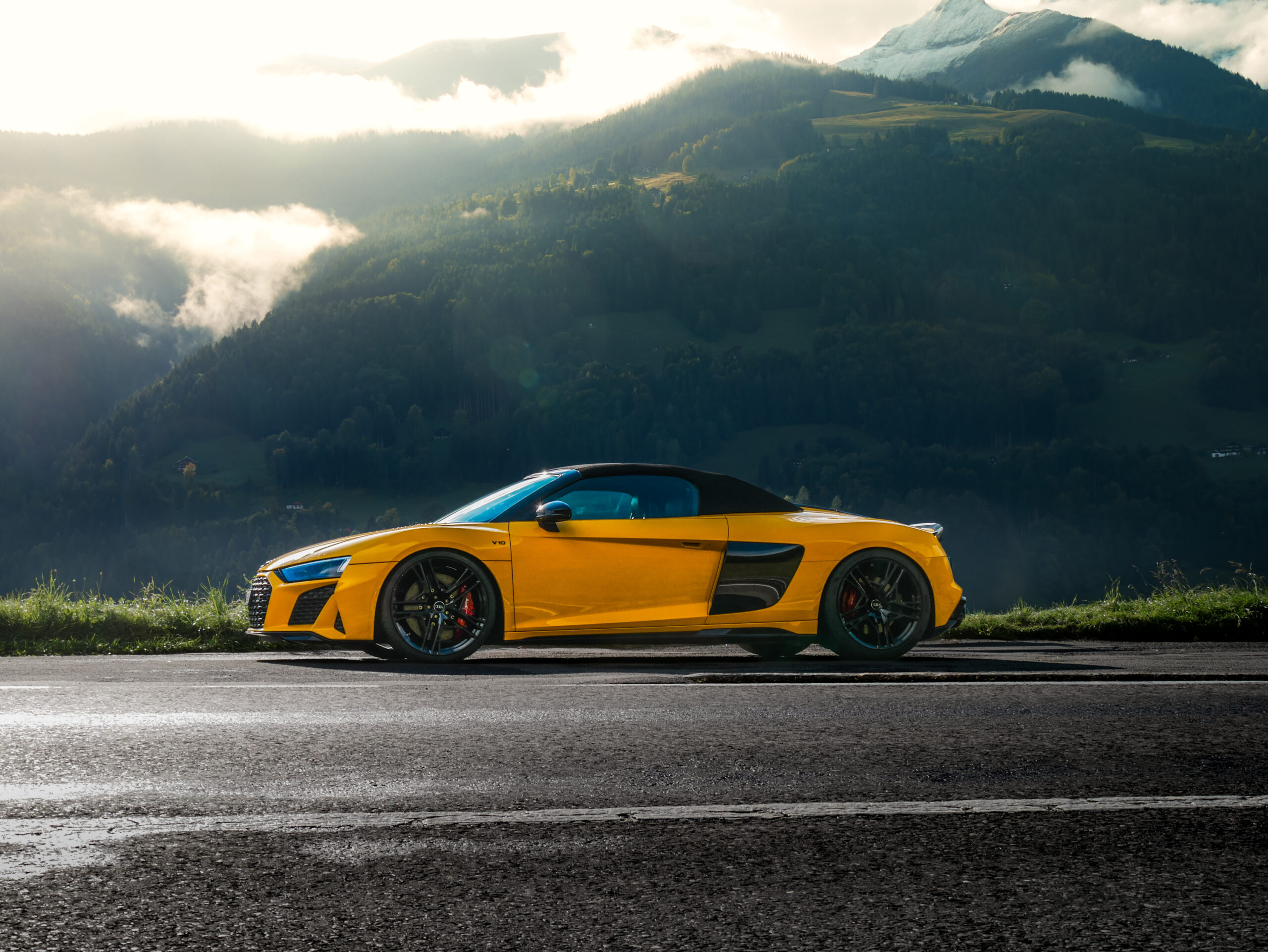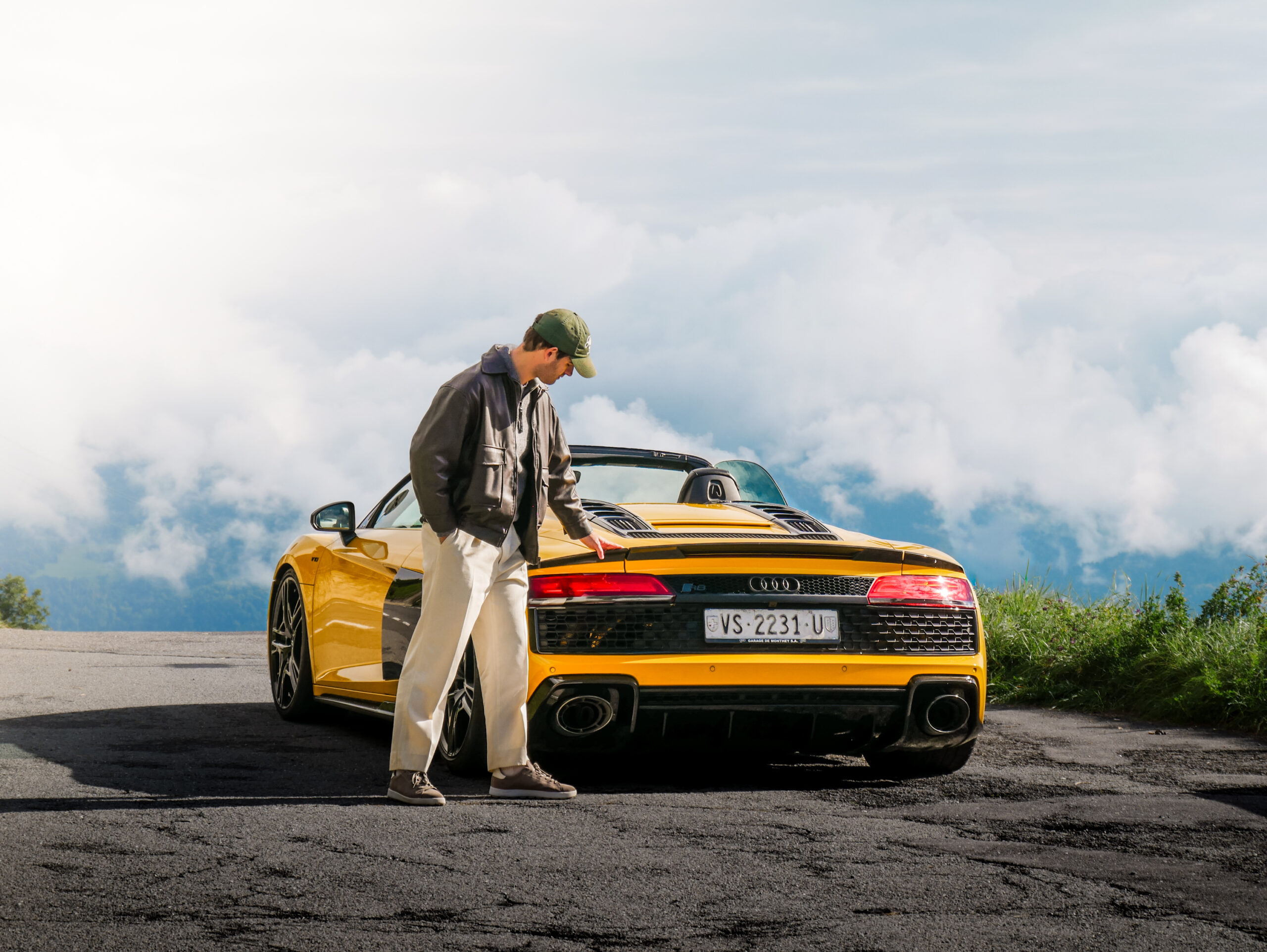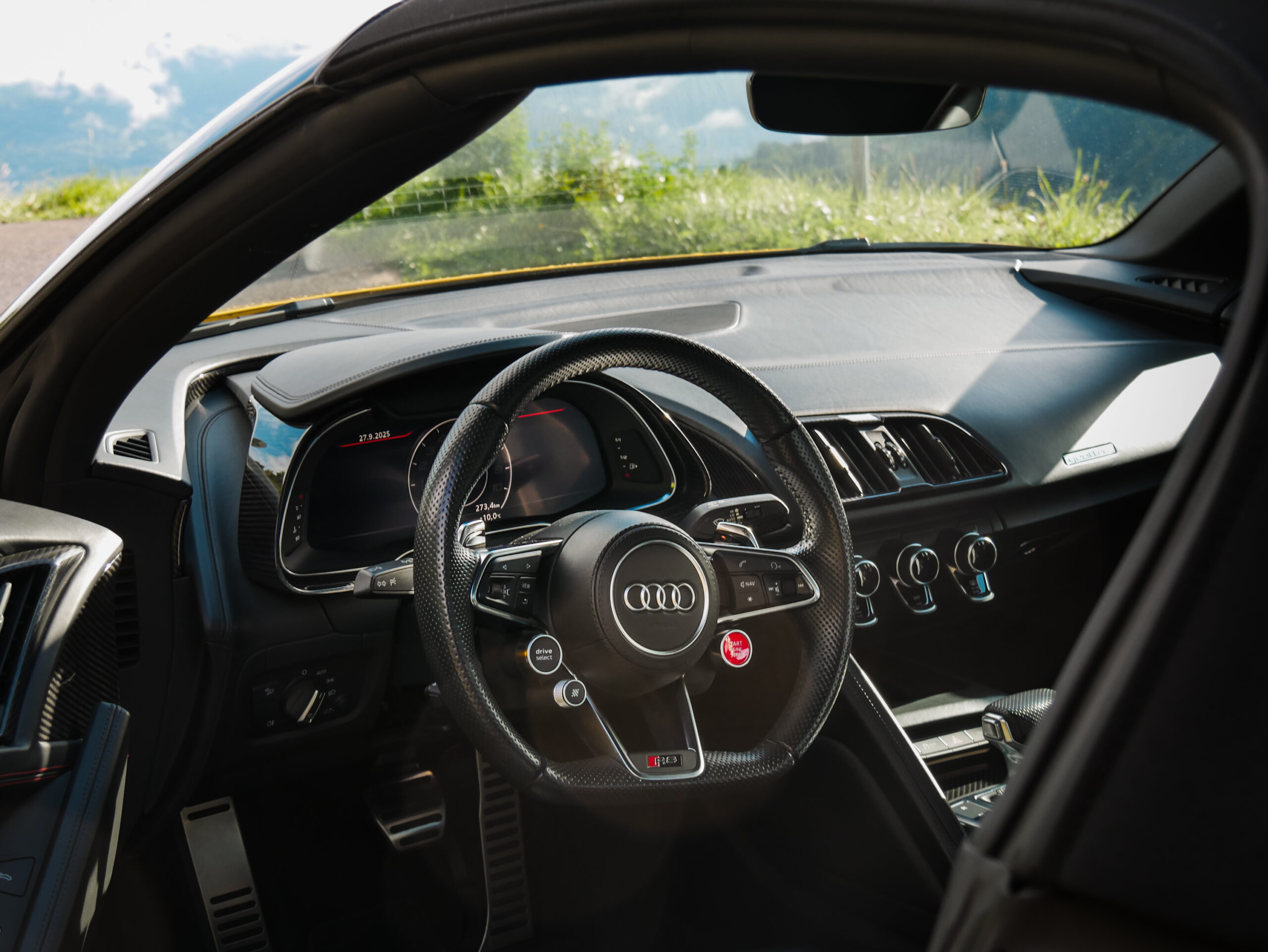 Un seul regard suffit pour comprendre. La R8 Spyder impose son allure racée, basse, large, sensuelle. Ses lignes évoquent clairement son sang à moitié italien, avec une rigueur germanique qui la rend intemporelle : sous un angle, c’est une Lamborghini, sous un autre, c’est une Audi. Son profil élancé avec son capot court ne lui confère peut-être pas l’élégance d’une grande GT, mais sa poupe profilée et les imposantes entrées d’air latérales indiquent où bat le coeur du roadster. Le carbone souligne chaque détail, le béquet complète sa posture agressive, et les sorties d’échappement béantes rappellent que cette voiture vit pour respirer. Ce n’est pas une supercar ostentatoire (quoique dans cette robe jaune…) : c’est une sculpture roulante, une machine qui attire les regards par sa présence plus que par sa provocation.