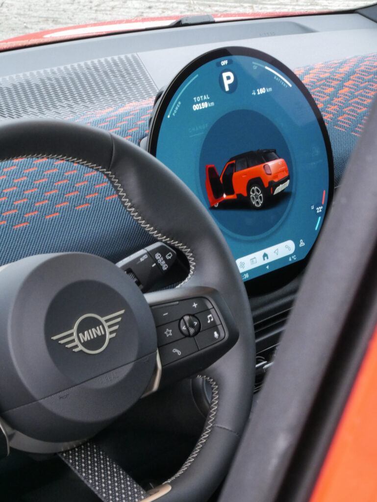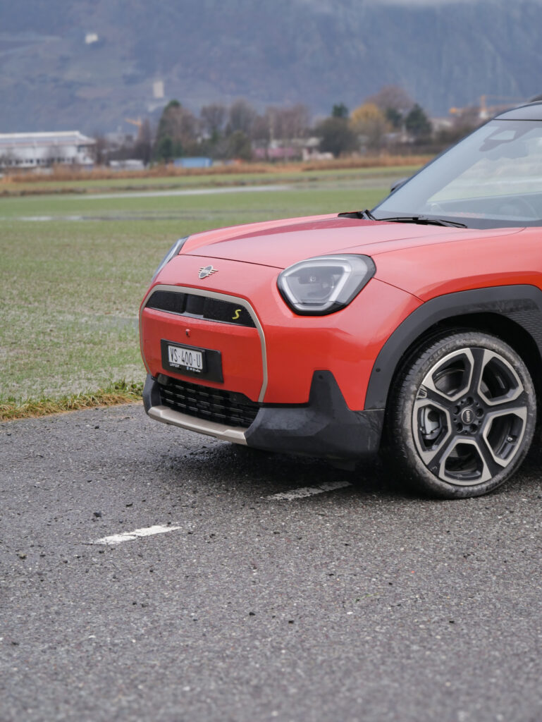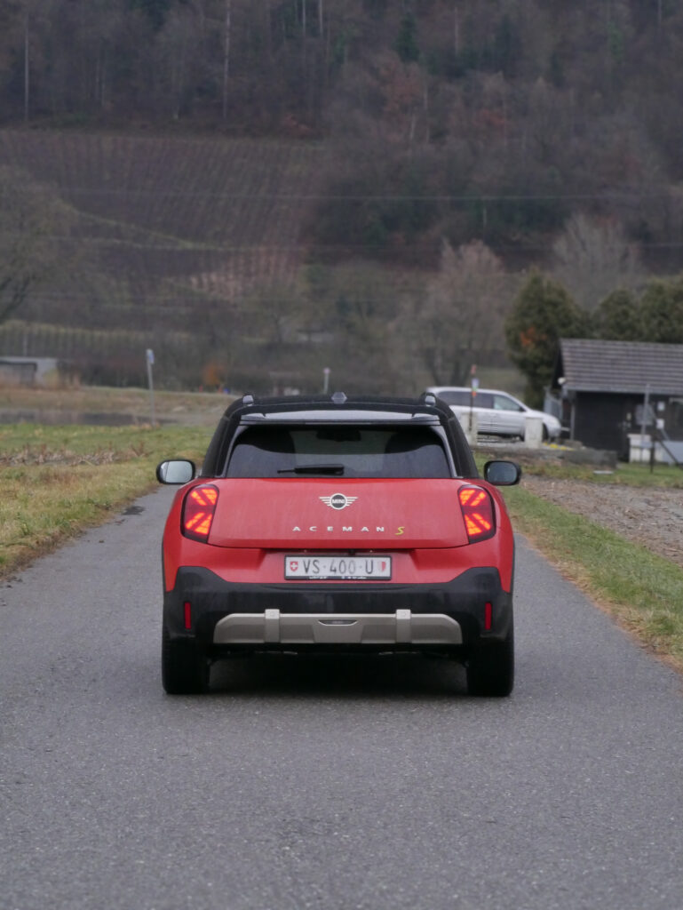 Sur la route, l’Aceman offre une expérience de conduite agréable, même si elle n’égale pas la vivacité de la petite Mini trois portes. Les suspensions, un peu fermes, rappellent l’orientation sportive de la marque, mais peuvent fatiguer sur les longs trajets. Les différents modes de conduite ajoutent une touche ludique appréciable, permettant de personnaliser l’expérience selon l’humeur du conducteur. Attention cependant sur les routes valaisannes glissantes ; contrairement à son grand frère Countryman, le Aceman n’est pas disponible en quatre roues motrices.