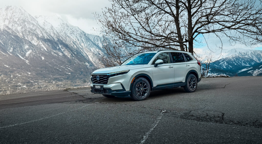 La motorisation eHev mérite également un mot. Le moteur thermique n’est pas là pour propulser directement la voiture, mais pour recharger la batterie. En conduite coulée sur les routes alpines sinueuses, c’est un régal de douceur et d’efficacité. En conduite sportive, en revanche, le système montre ses limites — mais franchement, ce n’est pas ce qu’on lui demande. Une Honda CR-V, c’est fait pour arriver sereinement à destination, pas pour doubler dans les épingles. Et avec une console moyenne de 6,5l / 100 km, c’est plus qu’honorable.
