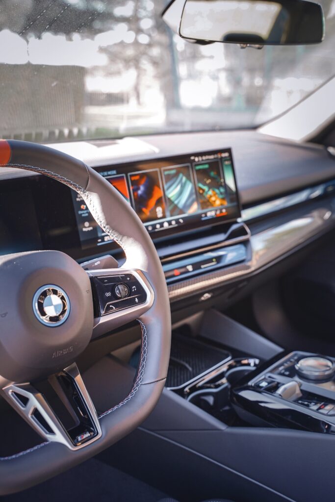 L’intérieur de la BMW i5 est un mélange audacieux de technologie futuriste et de design raffiné. Matériaux écoresponsables et finitions soignées créent un luxe durable. Une large interface panoramique domine le tableau de bord, s’intégrant parfaitement à l’esthétique minimaliste et fluide. Le système d’infodivertissement, basé sur la dernière version de l’iDrive de BMW, offre une connectivité intuitive et un contrôle simplifié. L’habitacle privilégie le confort avec des sièges ergonomiques et un espace généreux pour le conducteur comme pour les passagers.